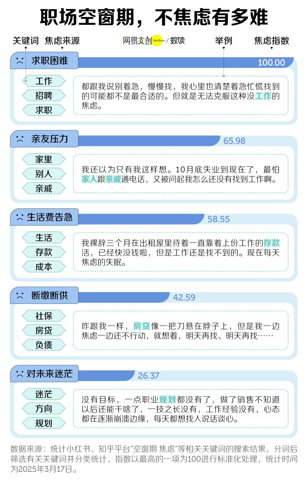 细看在职场空窗期内会让大家倍感焦虑的原因, 会发现求职困难、亲友压力、生活费告急位列前三位。