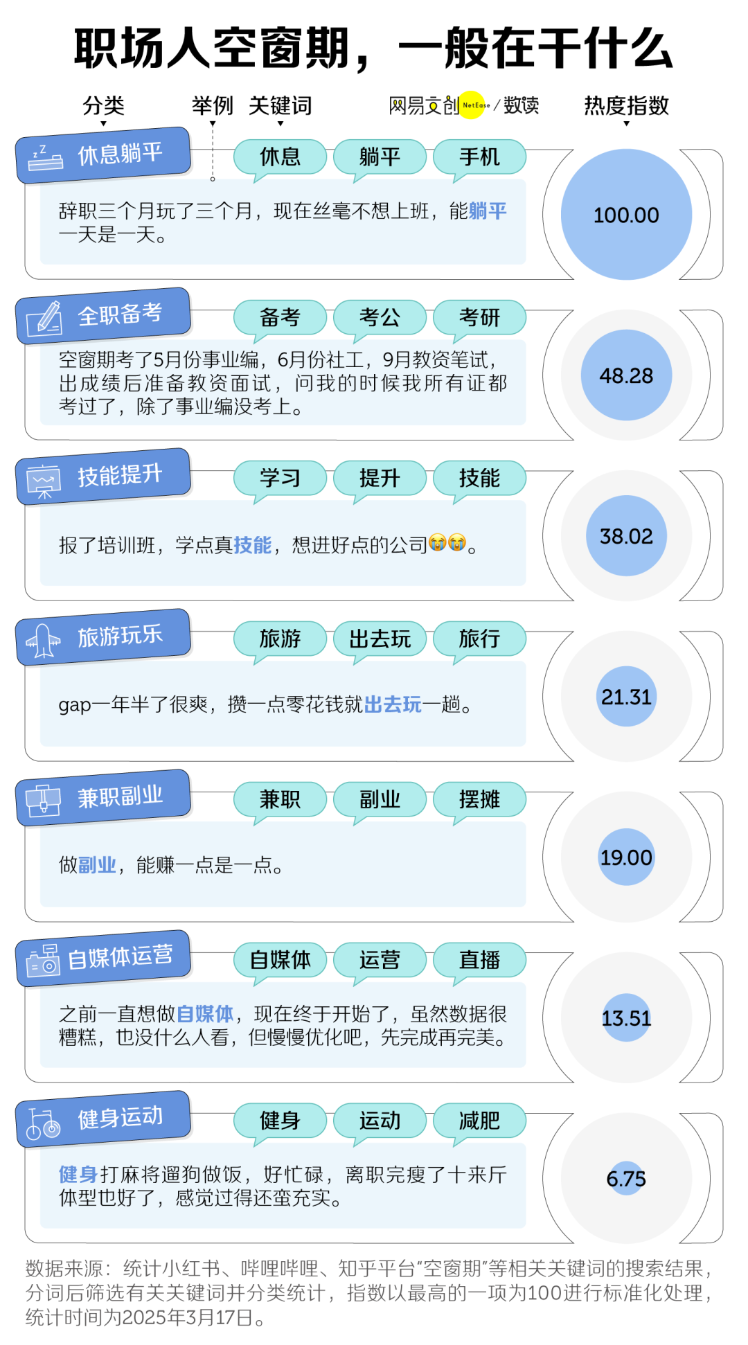 逃离“996”的格子间,进入职场空窗期后,大家都在干什么?我们发现 虽然休息躺平是大多数人的主旋律,可离开职场都没能真正放松下来的,也不乏少数。