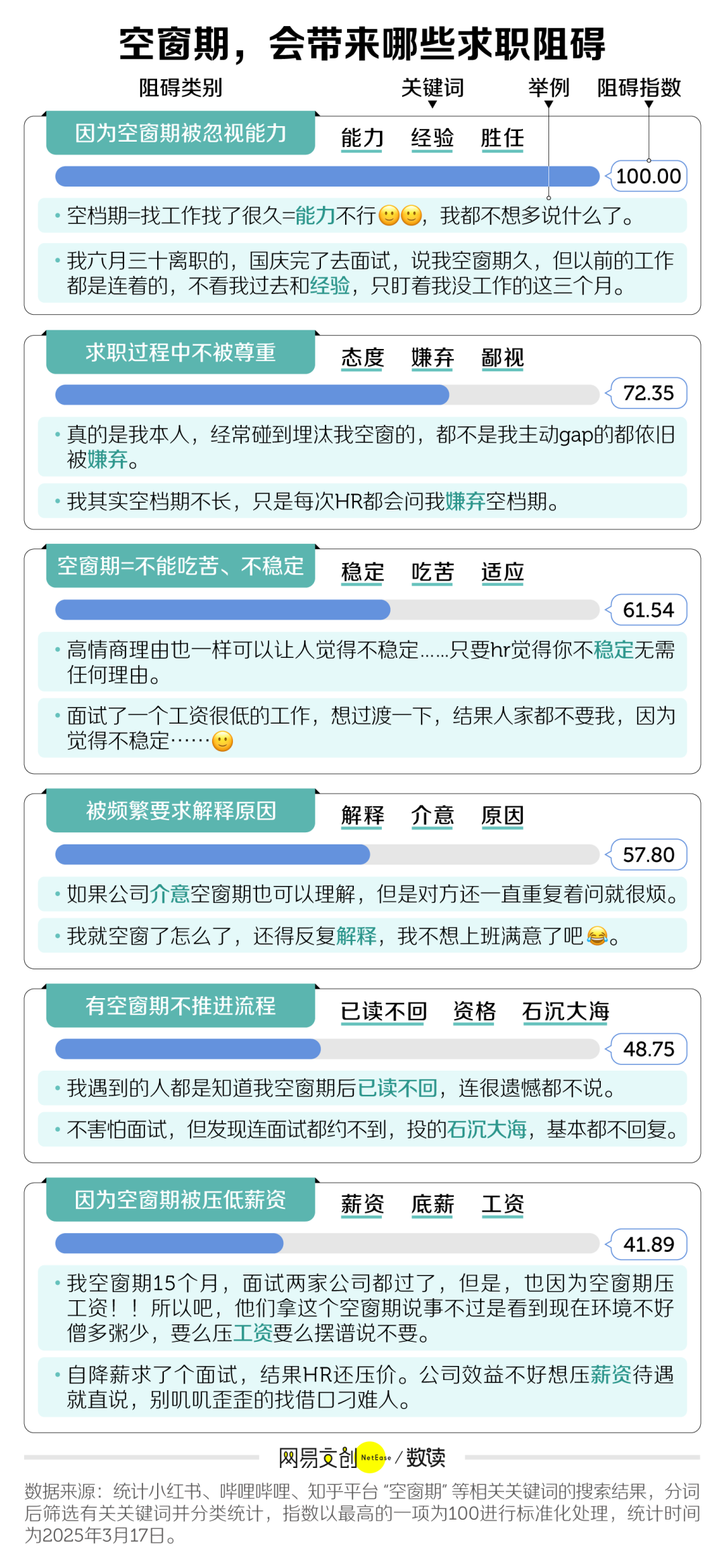 当然, 最严重的后果还是求职路变得坎坷。 很多人都提到自己面试时会遭遇求职单位的审问,仿佛空窗期有罪;还会质疑自己的能力,让人百口莫辩。