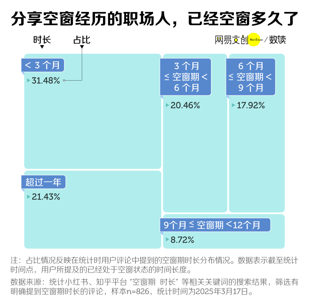 为了更好了解大家职场空窗期持续的情况,我们也对社交媒体上提及时长的讨论进行了统计,结果发现, 职场空窗期较长的情况的确不算少见,像超过一年的占比就达到了21.4%。