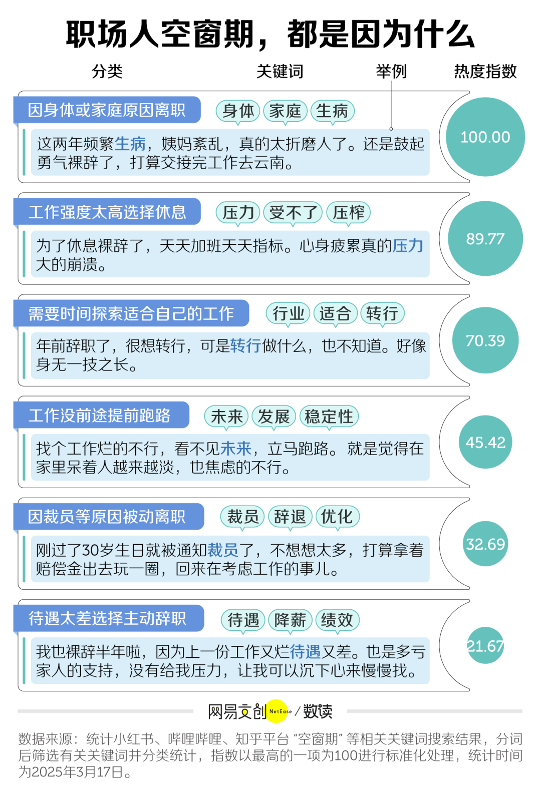 我们也整理了社交媒体上有关“空窗期”的讨论, 发现主动离职最常见的原因是身体或家庭。